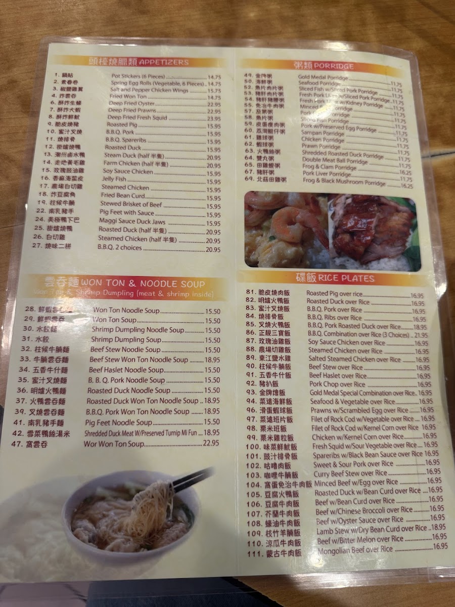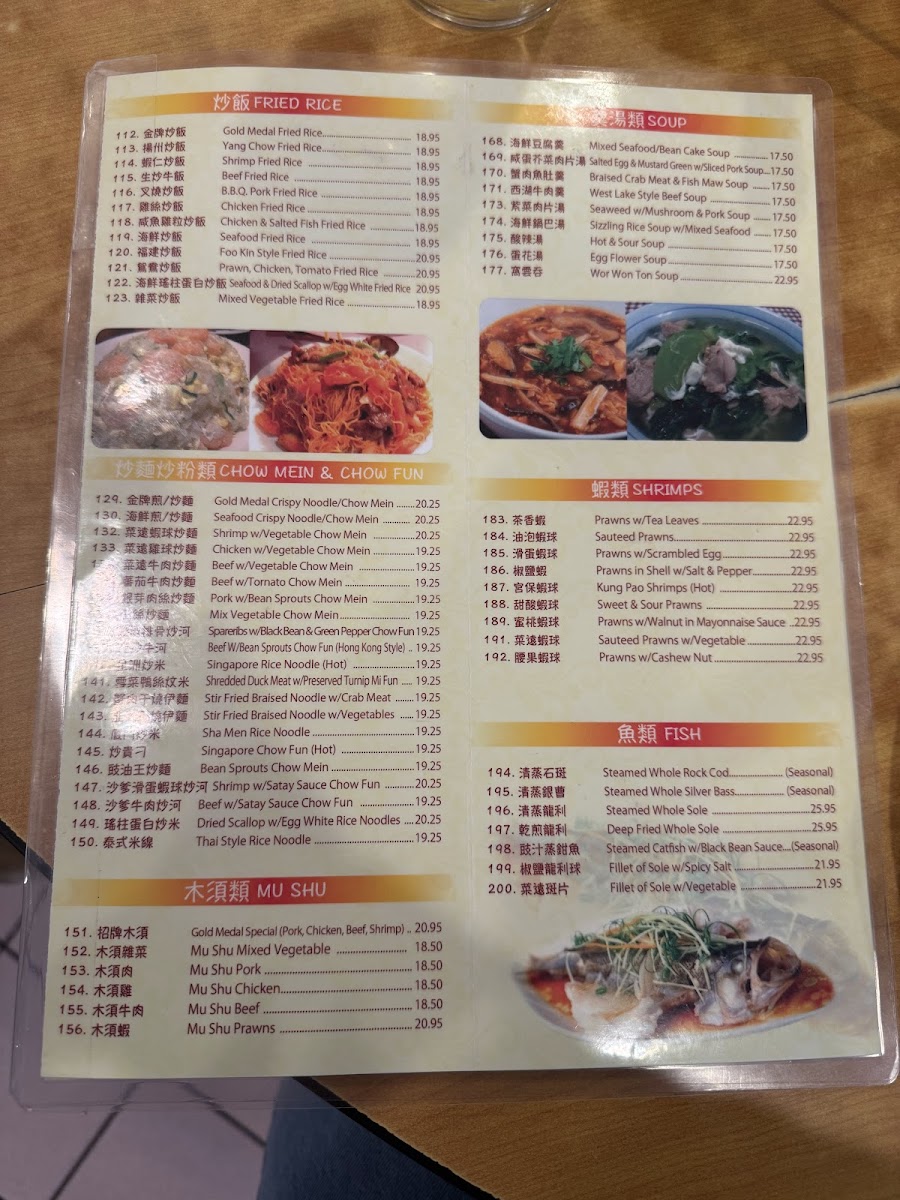 Signature dishes like the King Do Spareribs, Gold Medal Special Combination over Rice, and Seafood Crispy Noodle Chow Mein showcase traditional flavors prepared with generous portions. Soups such as Gold Medal Wor Won Ton and Braised Crab Meat & Fish Maw provide warming options, while roasted specialties like whole duck and chicken invite sharing in a laid-back setting.